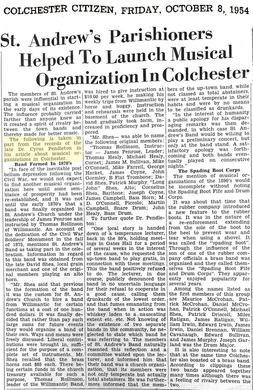 Dr. Cyrus Pendleton had an avid interest in Colchester history. A reprint of an account he wrote about the formation of nineteenth century musical organizations in Colchester was revived during the 100th Anniversary Celebration of Saint Andrew’s Church.
