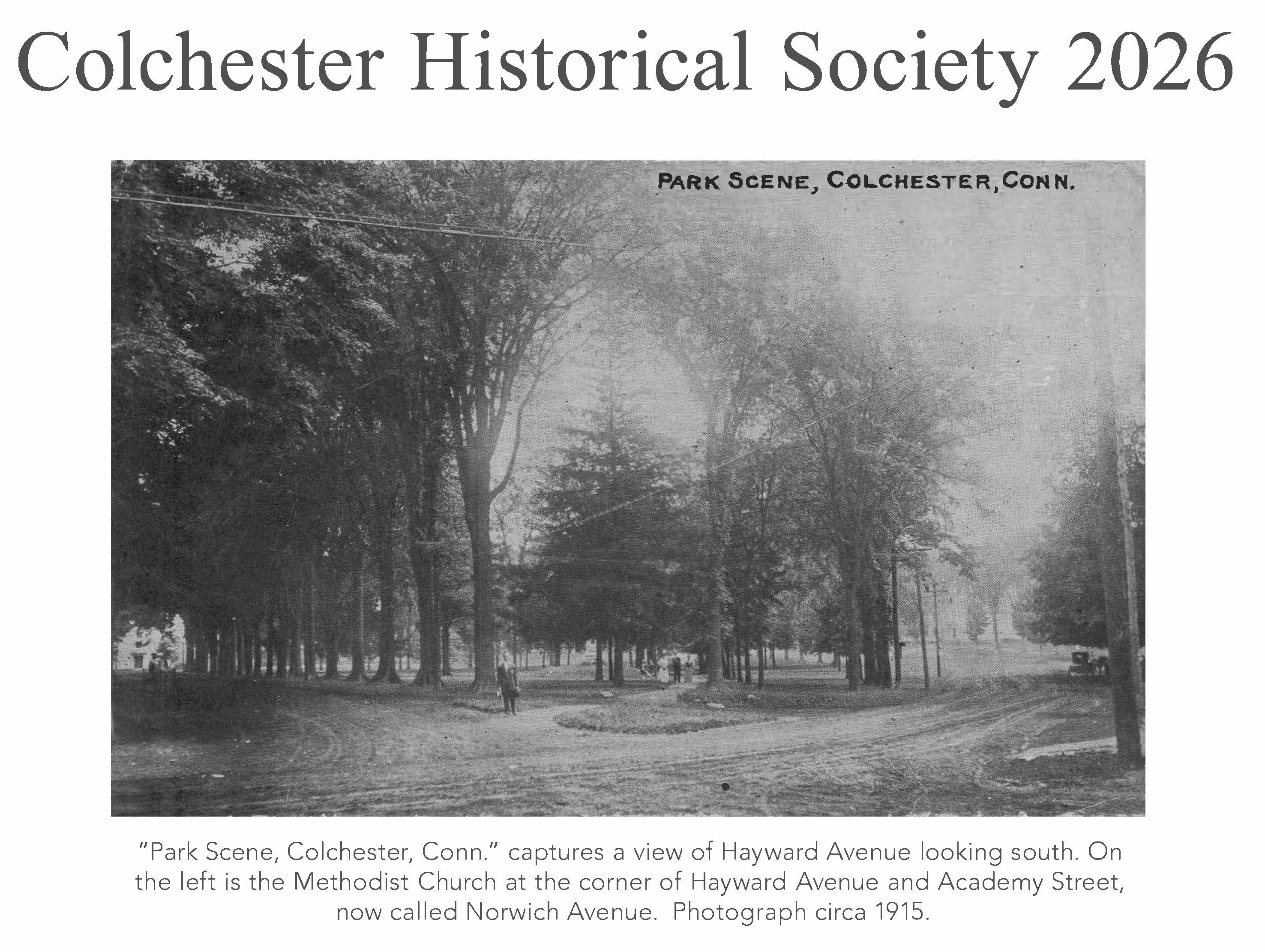 The Colchester Historical Society 2026 Calendar presents a monthly historical overview of Colchester’s Town Green and surrounding landmarks through photographs and descriptions, highlighting changes in the landscape, buildings, and community activities over time.